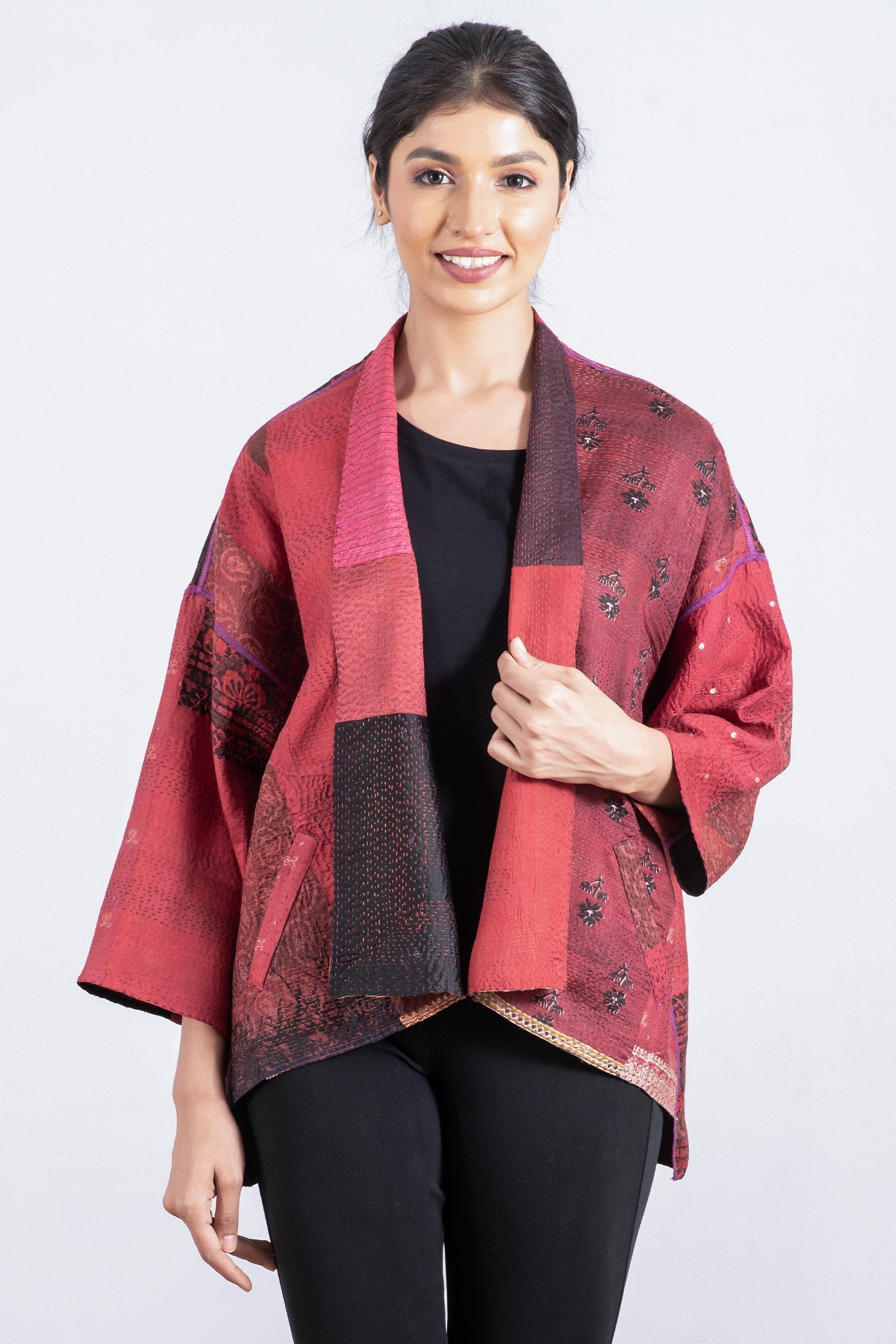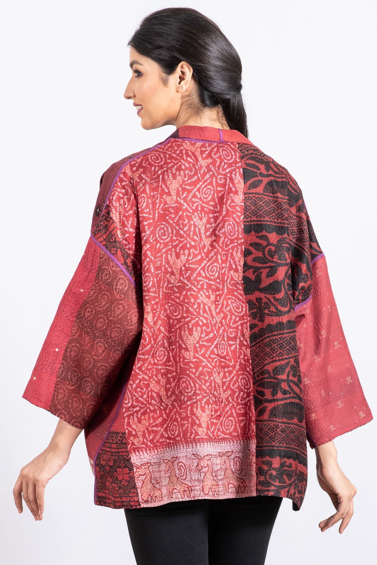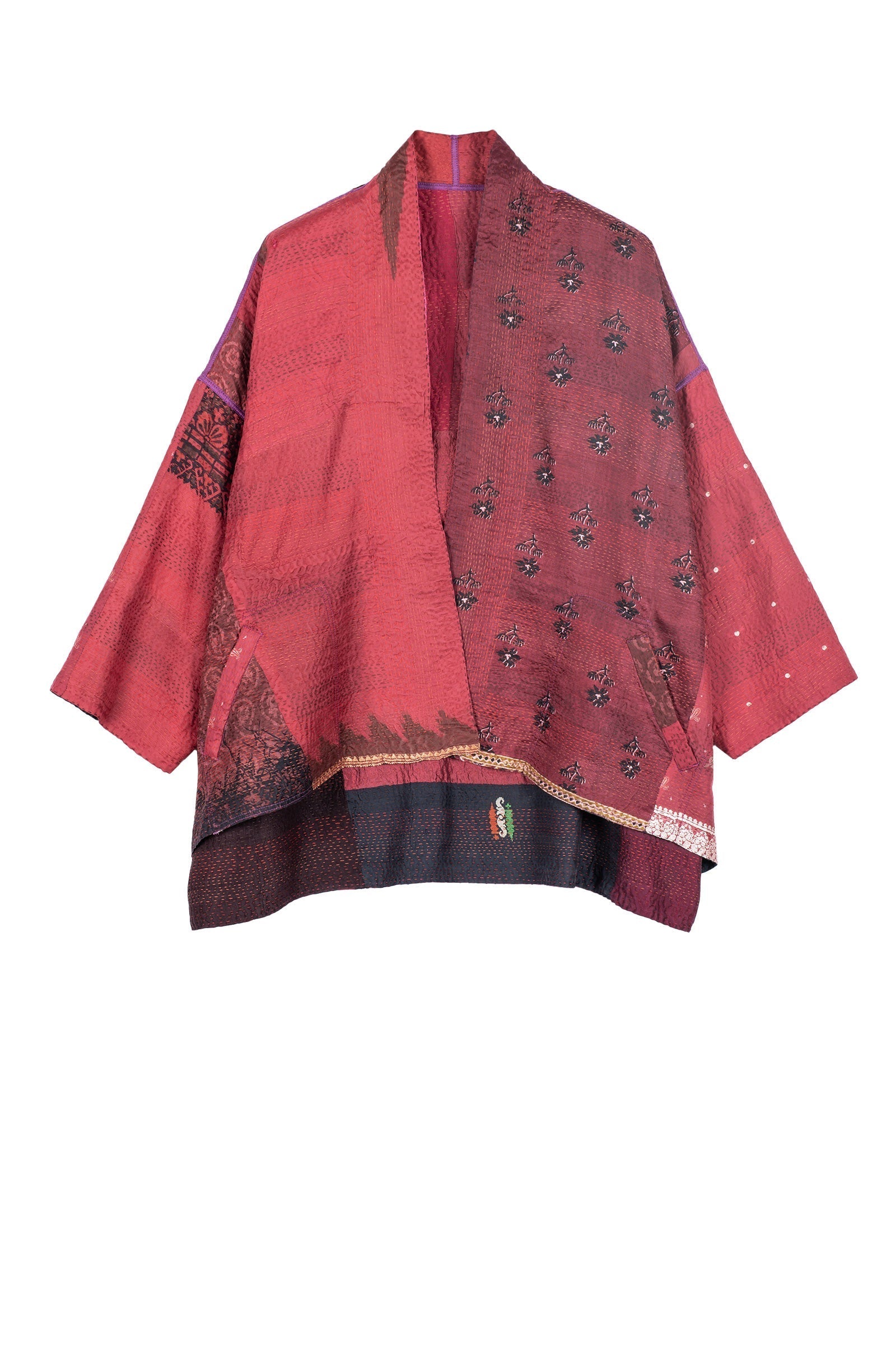 VINTAGE SILK PATCH KANTHA MINI KIMONO JKT - vp2055-red -