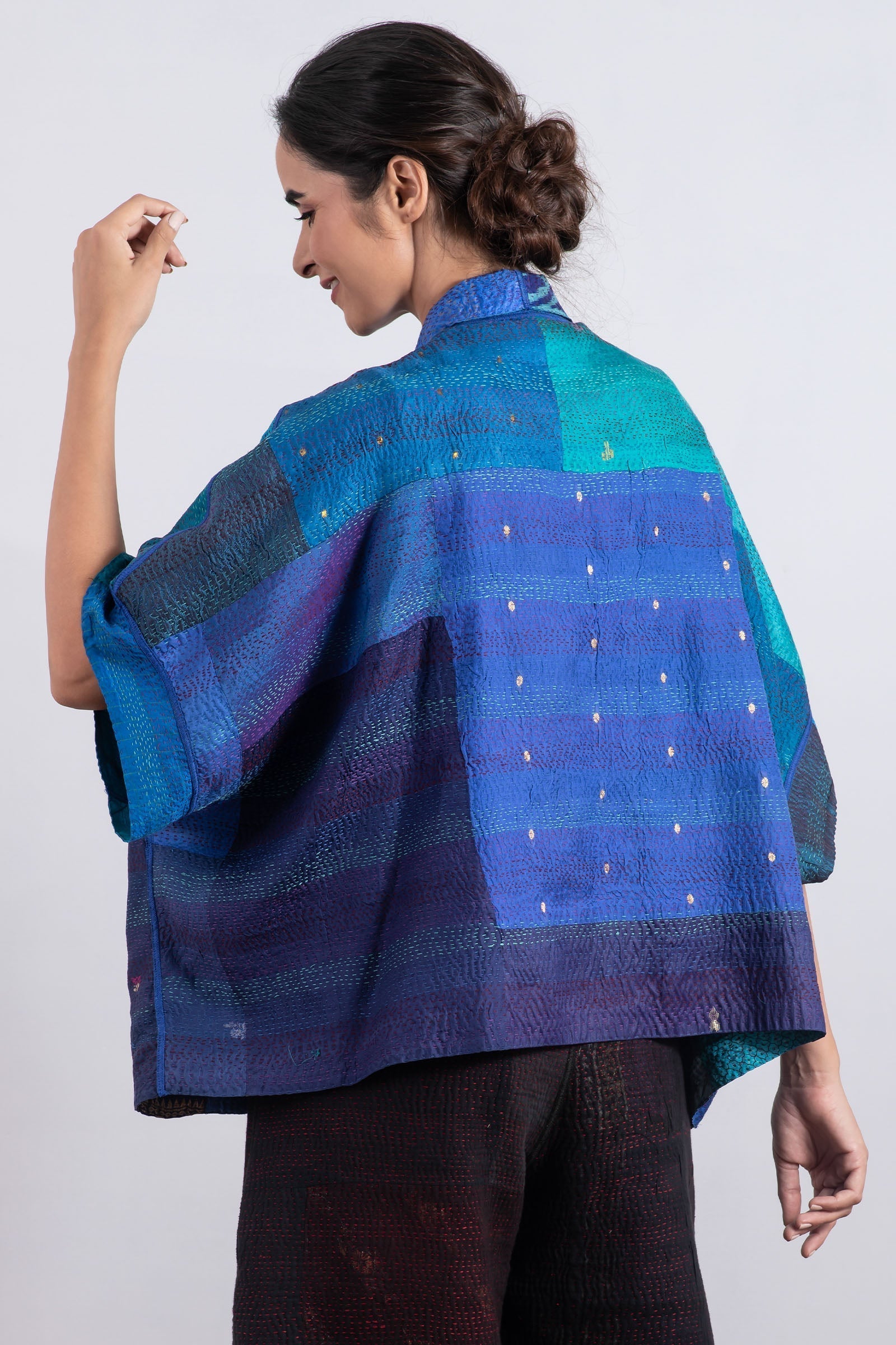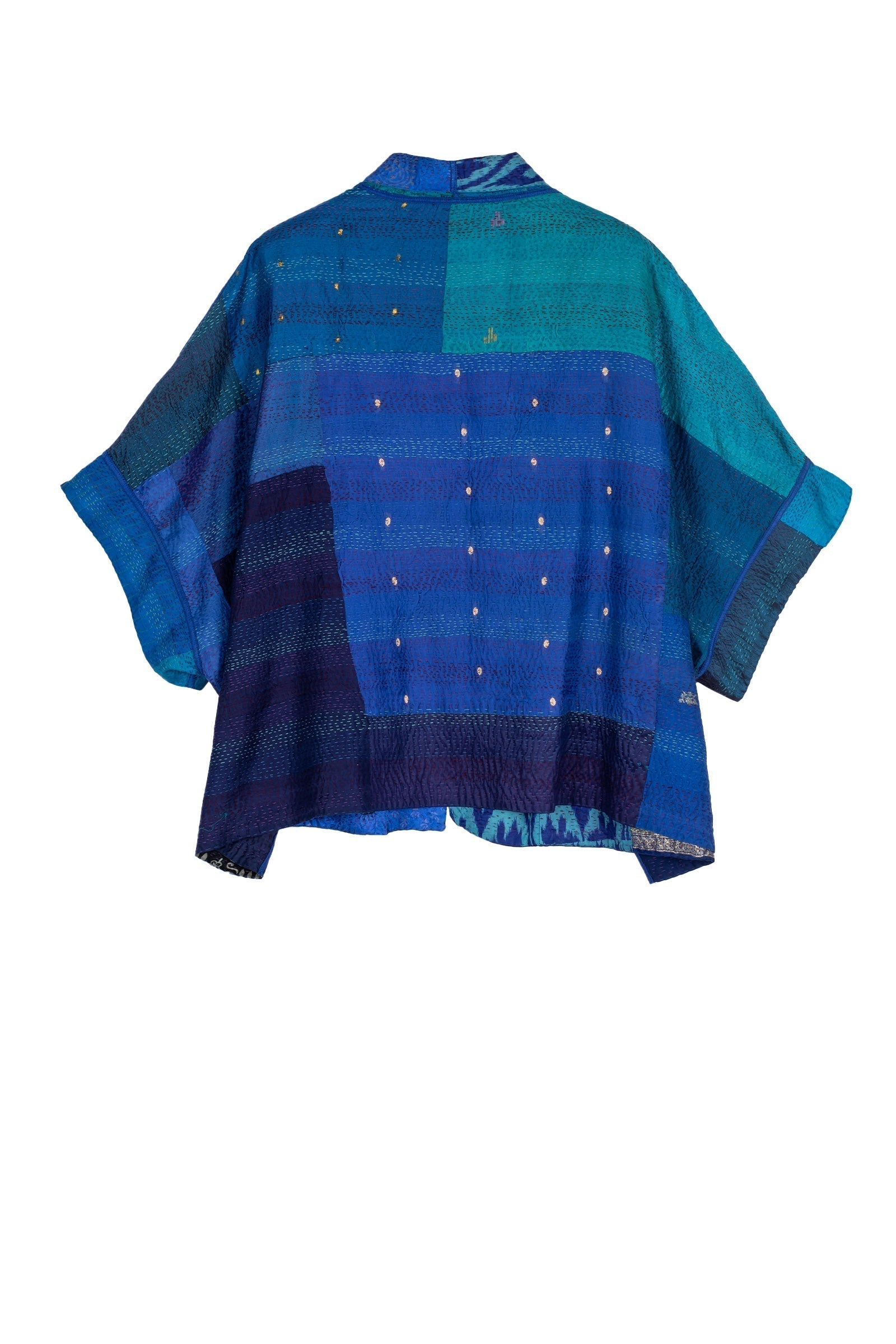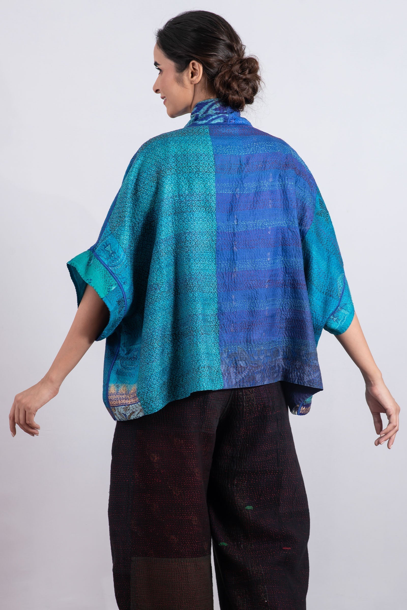 VINTAGE SILK PATCH KANTHA MINI PONCHO - vp2060-blu -