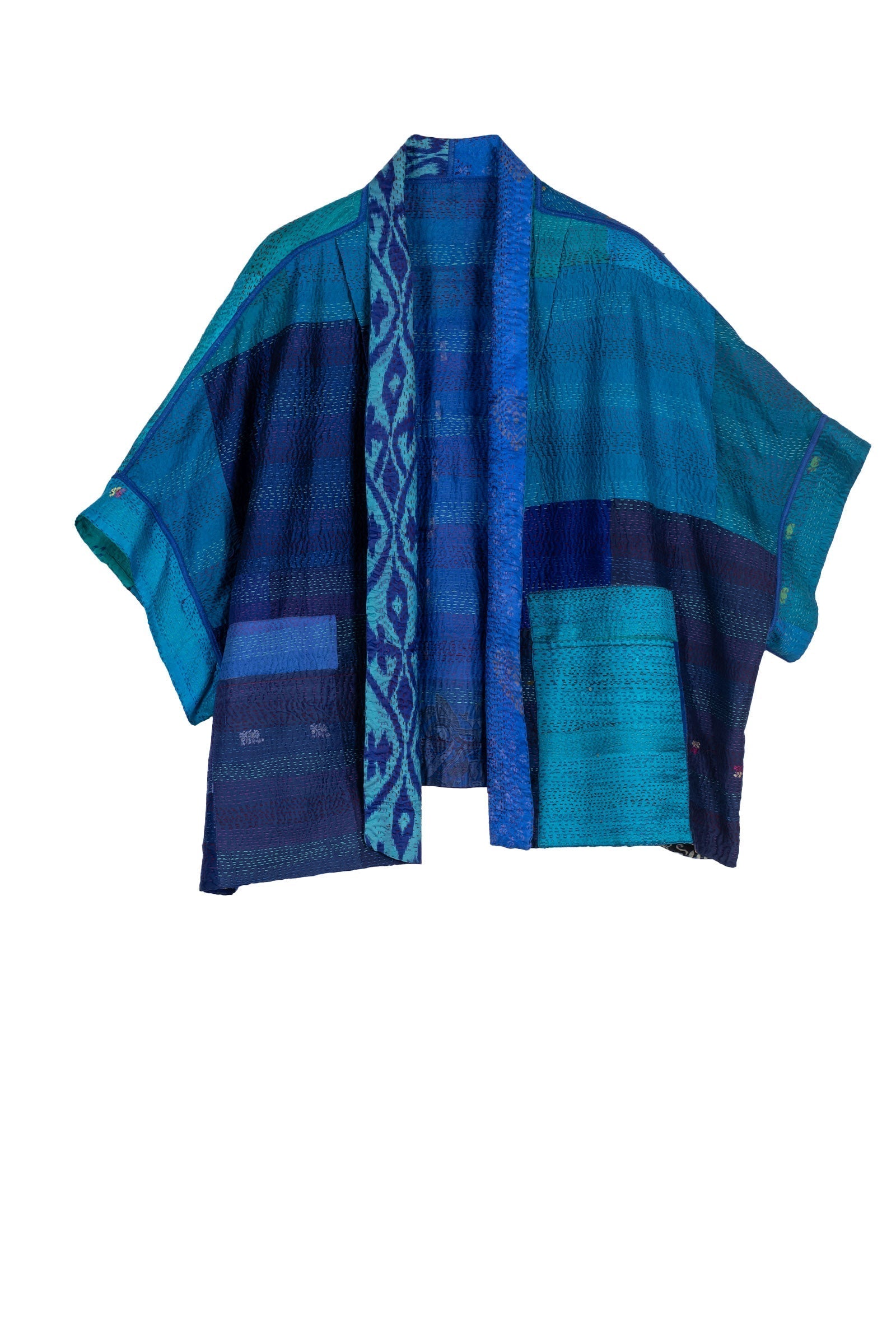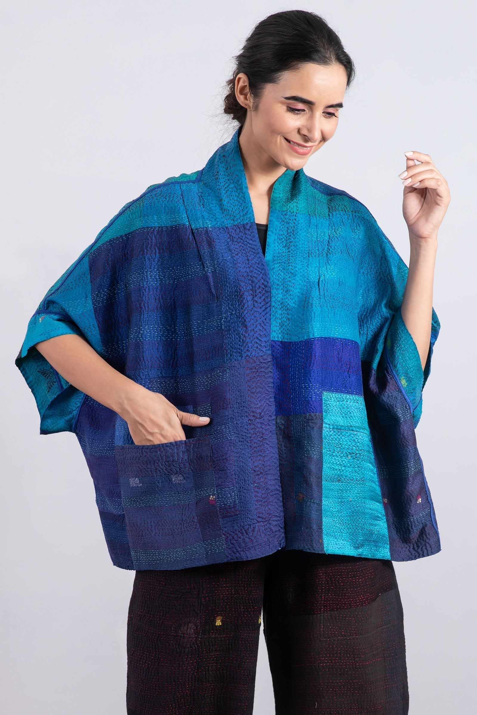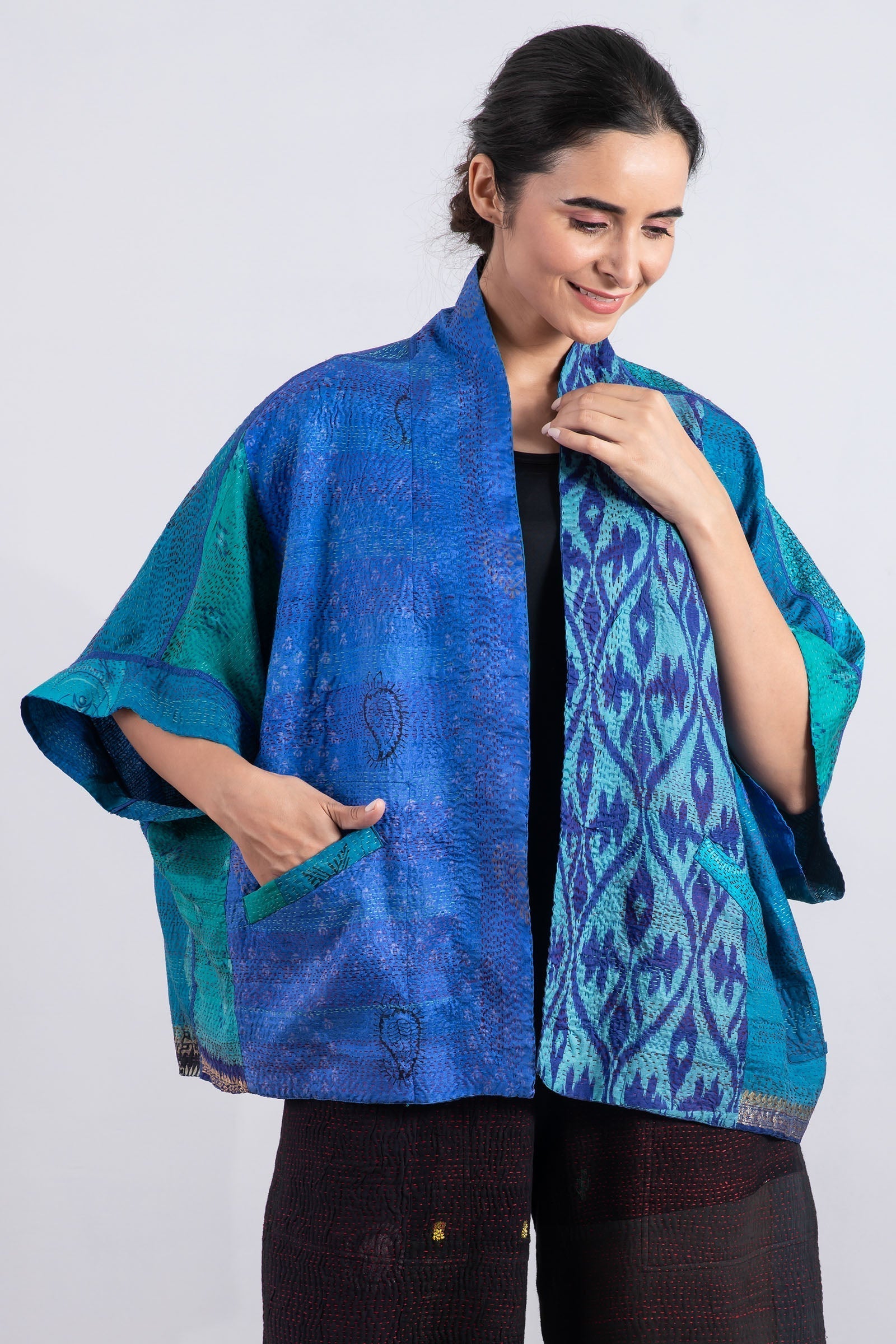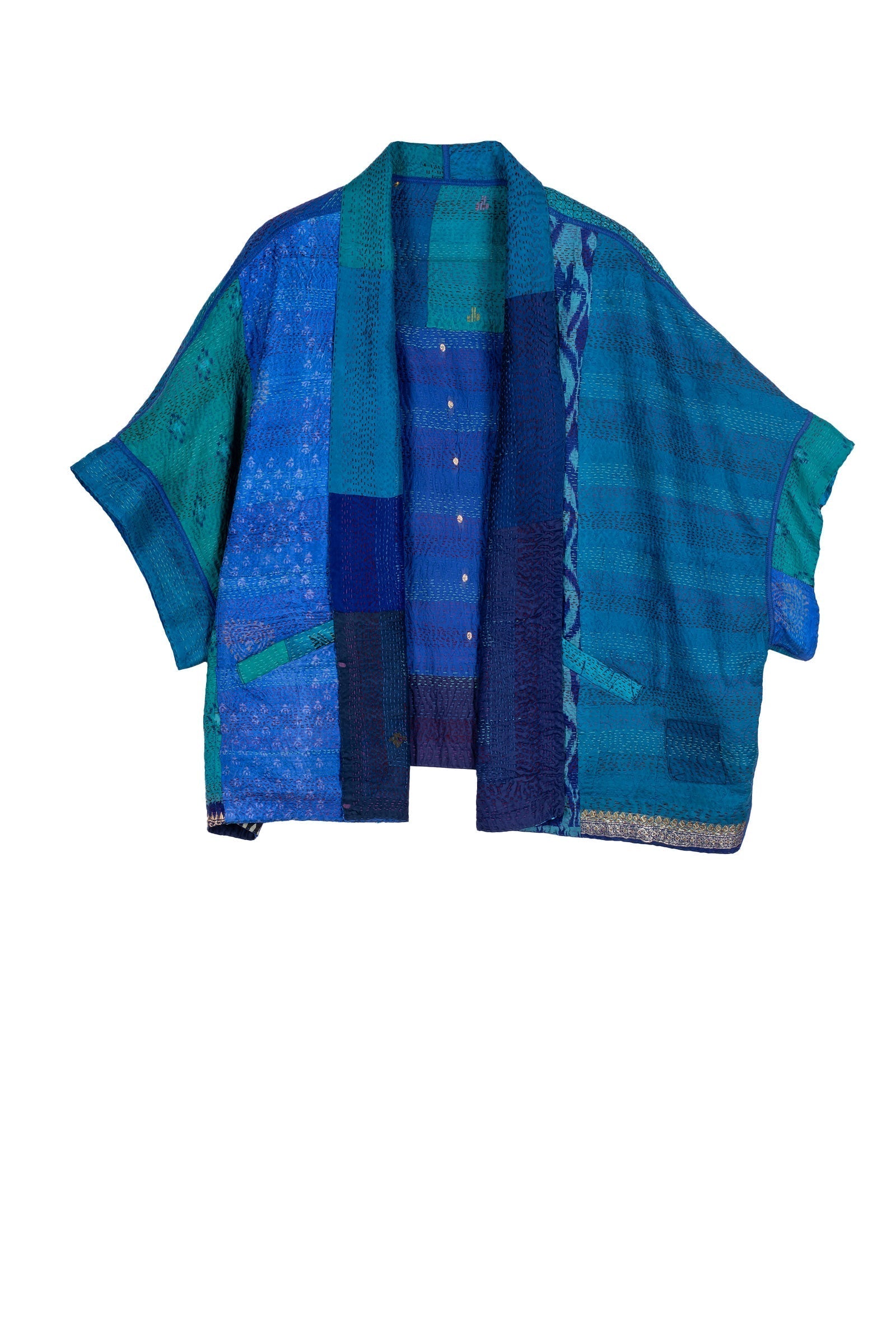 VINTAGE SILK PATCH KANTHA MINI PONCHO - vp2060-blu -