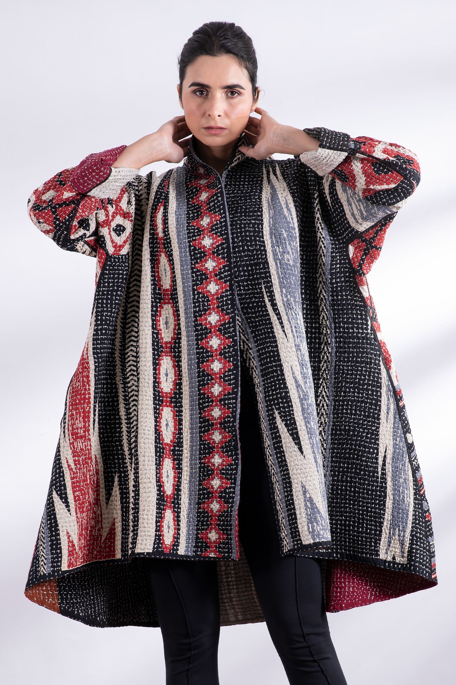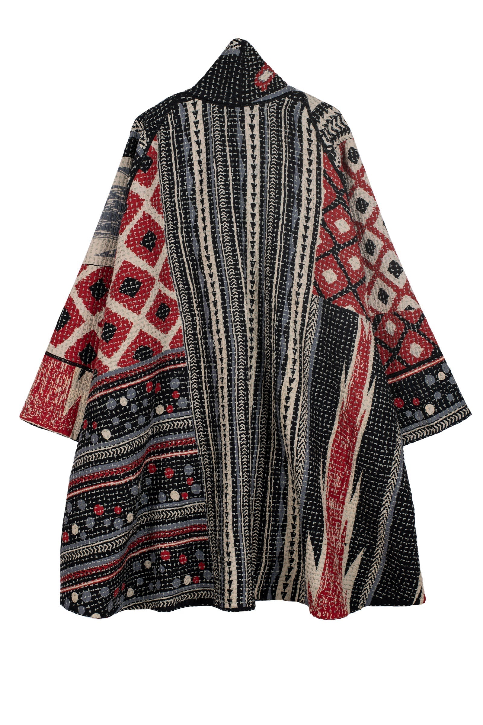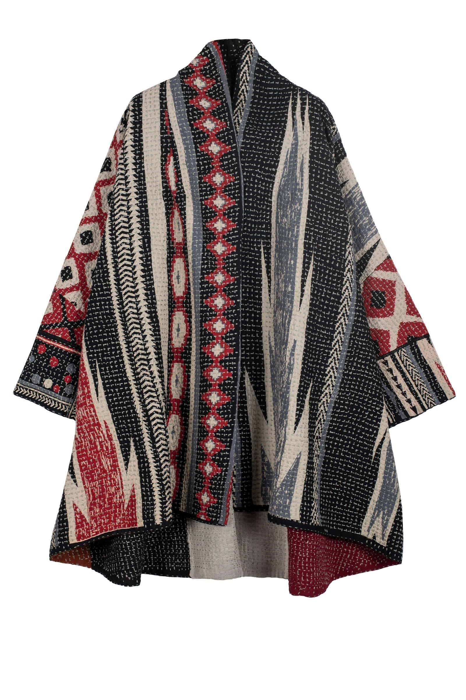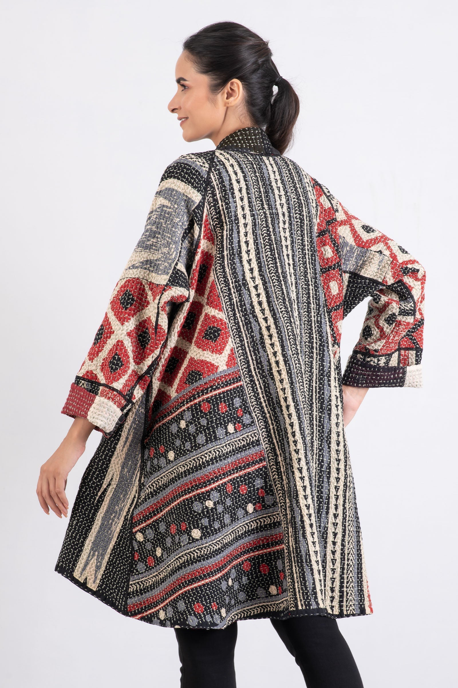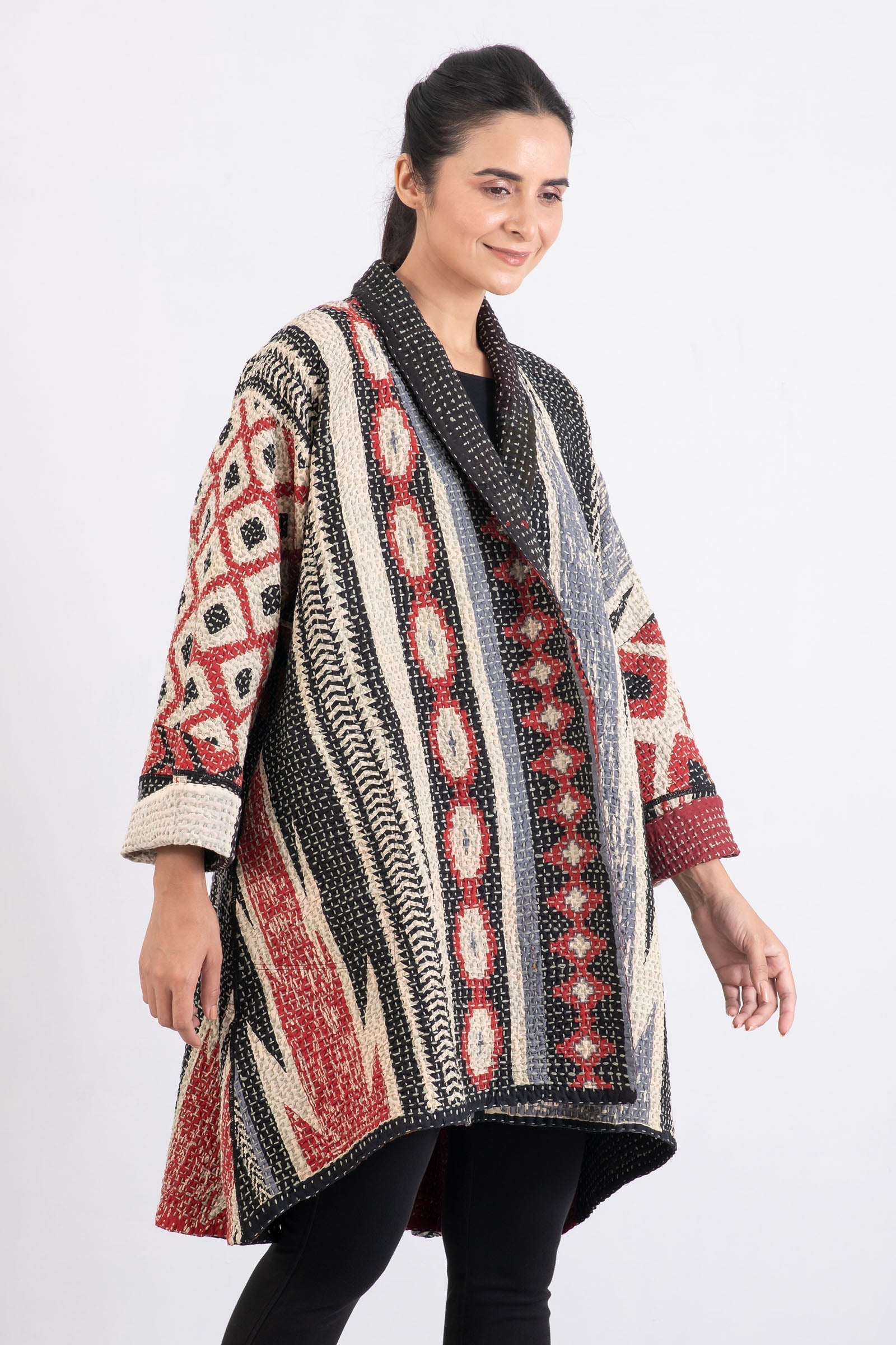 WAFFLE IKAT KANTHA KIMONO LONG JACKET - wi3005-red -