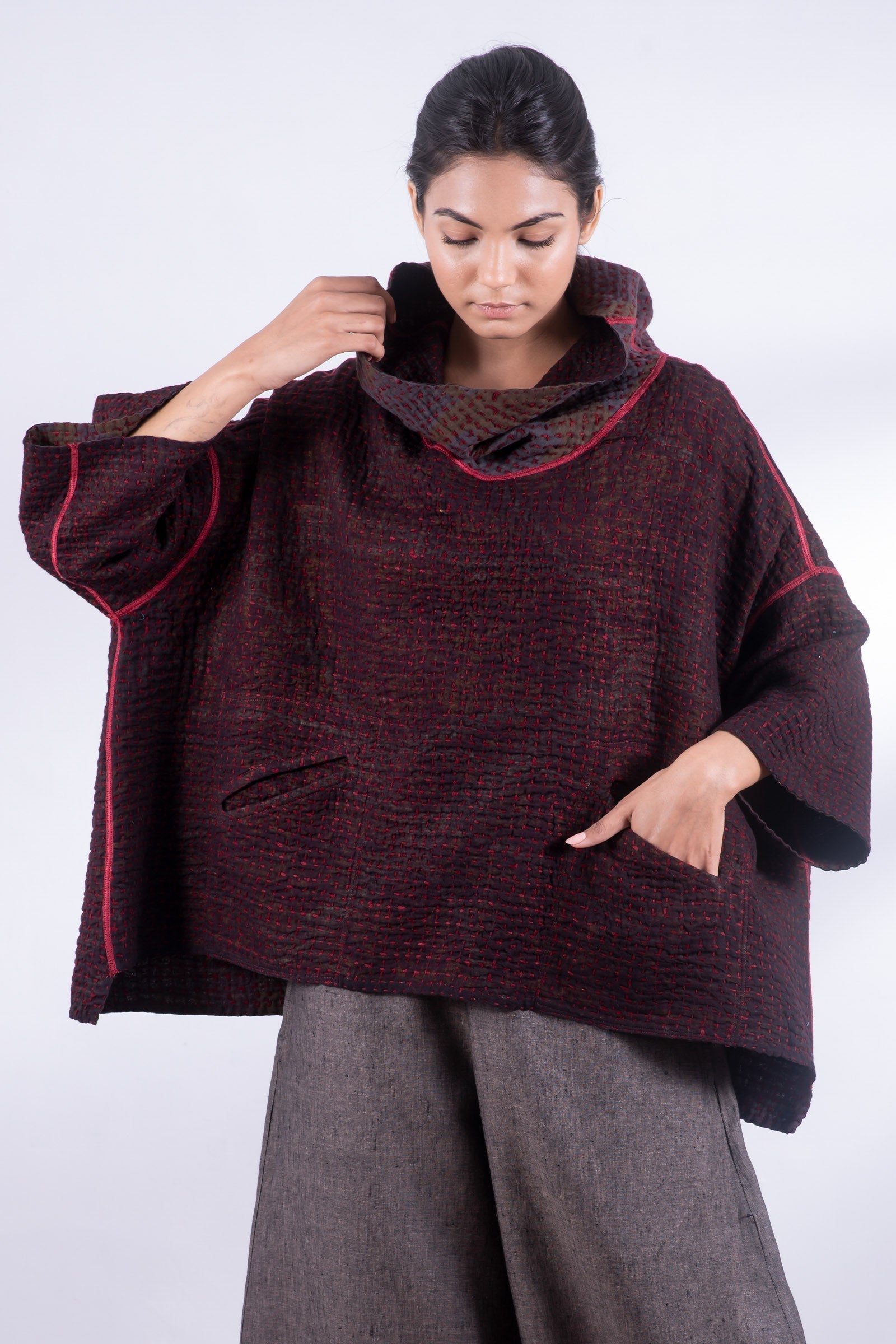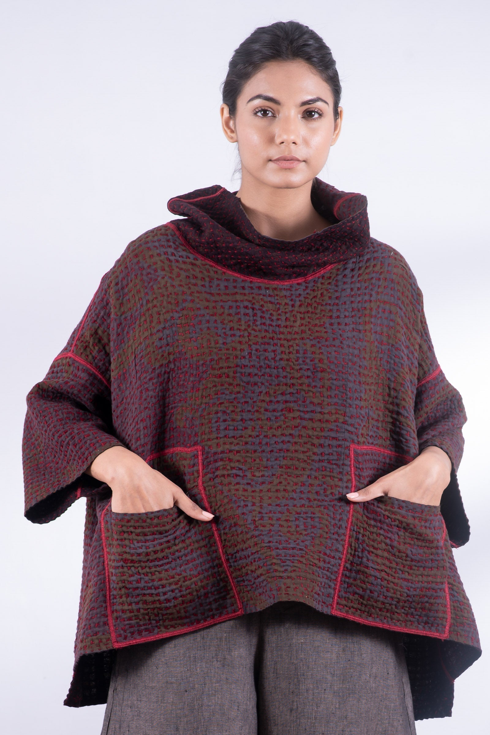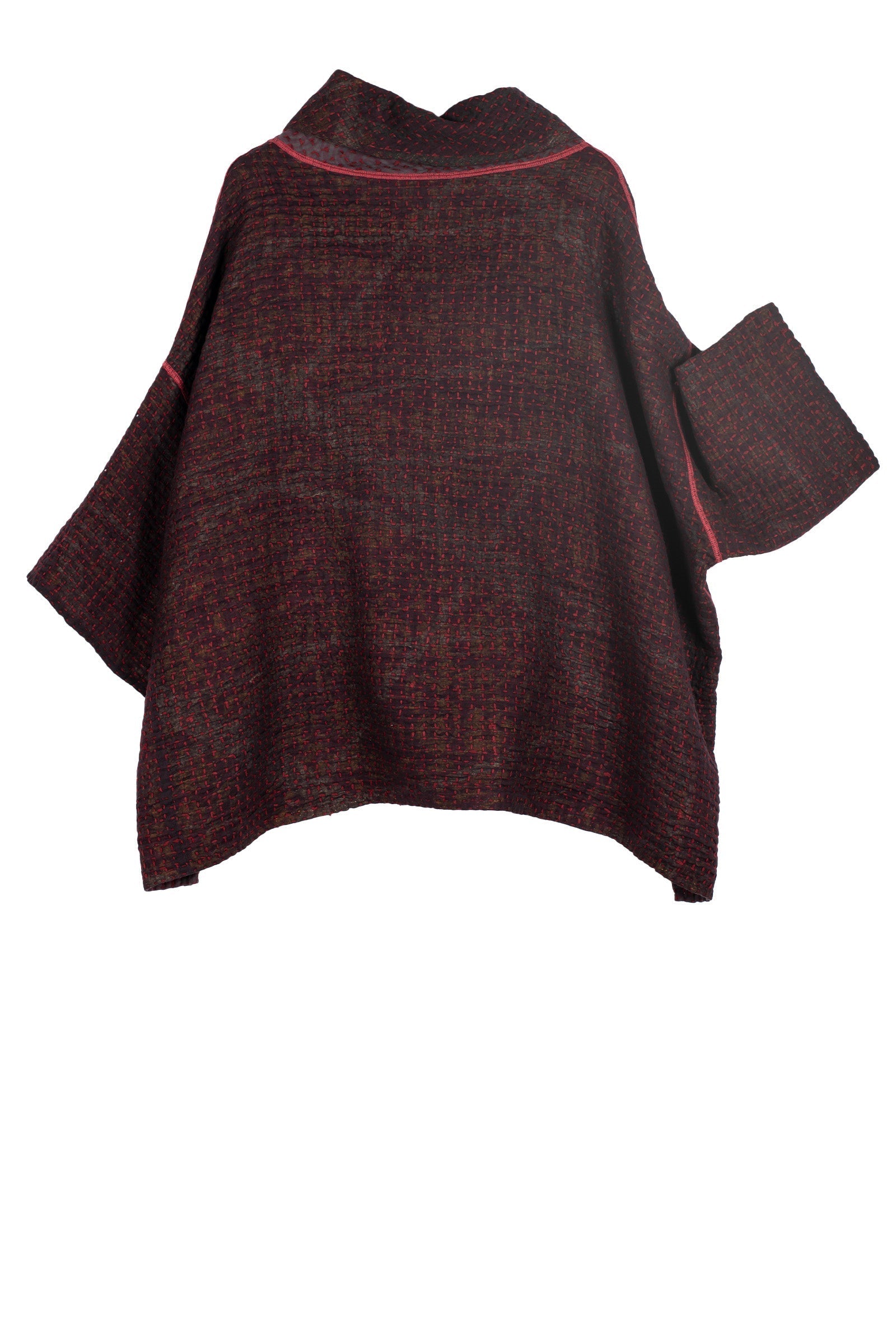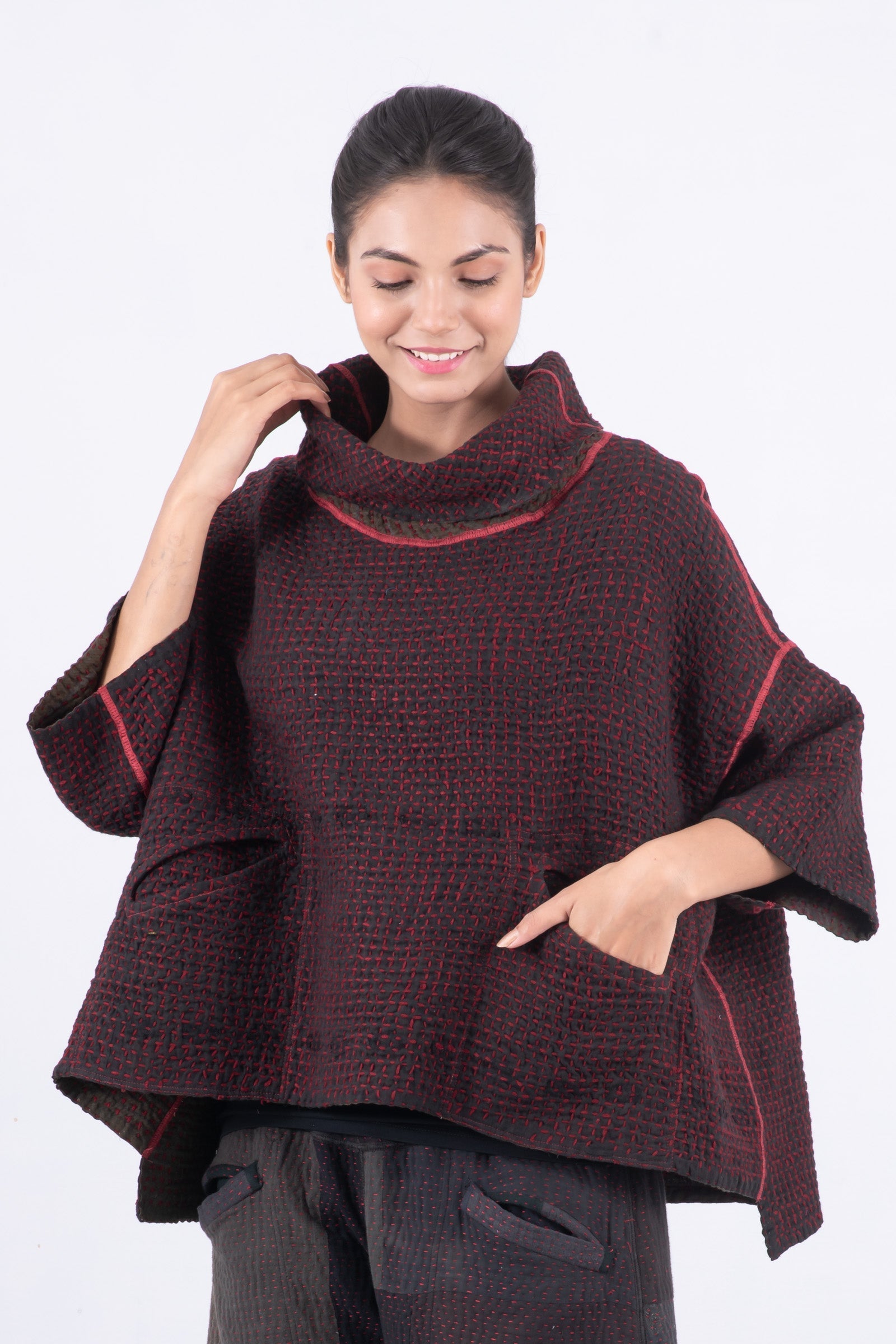 WOOL WAFFLE KANTHA COWL NECK PONCHO - ww3061-red -