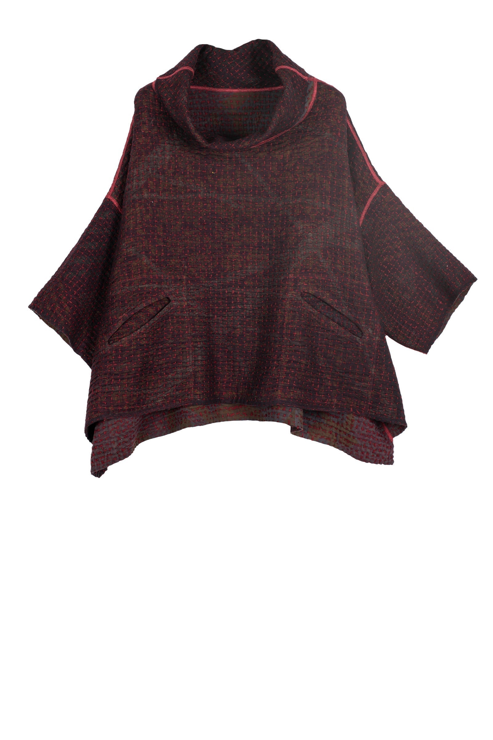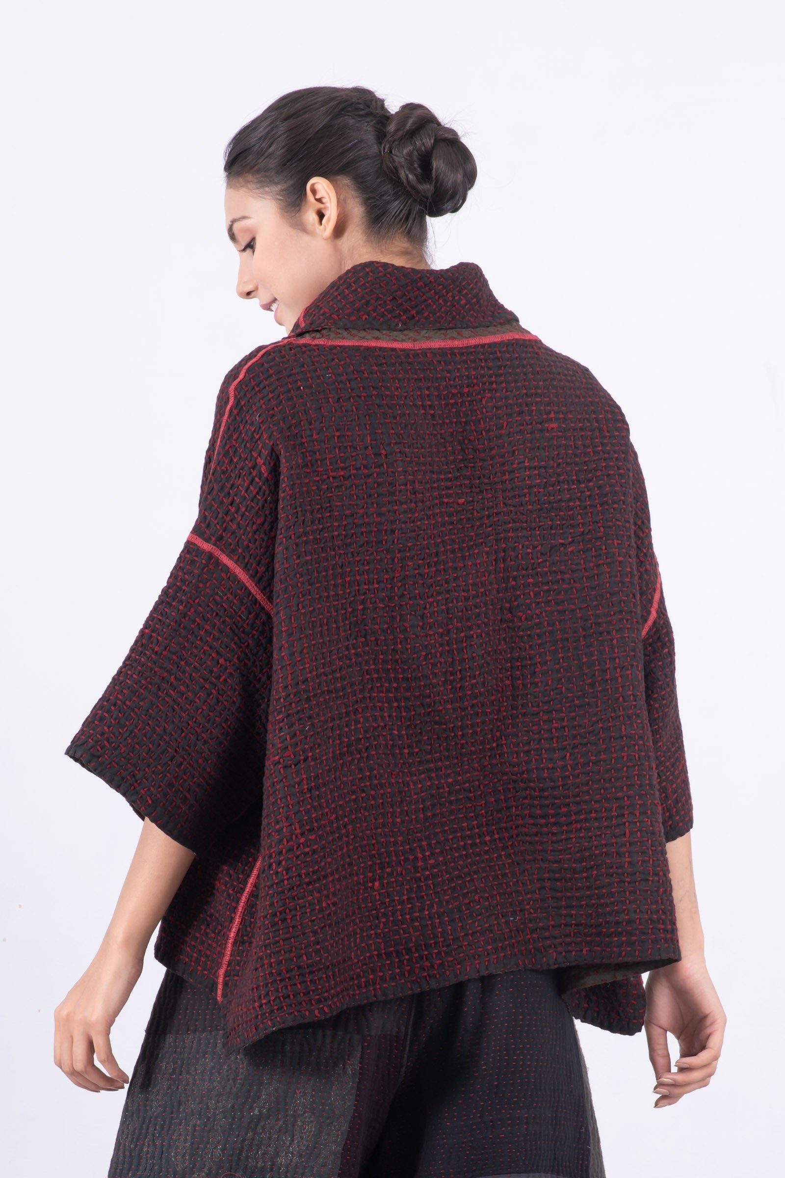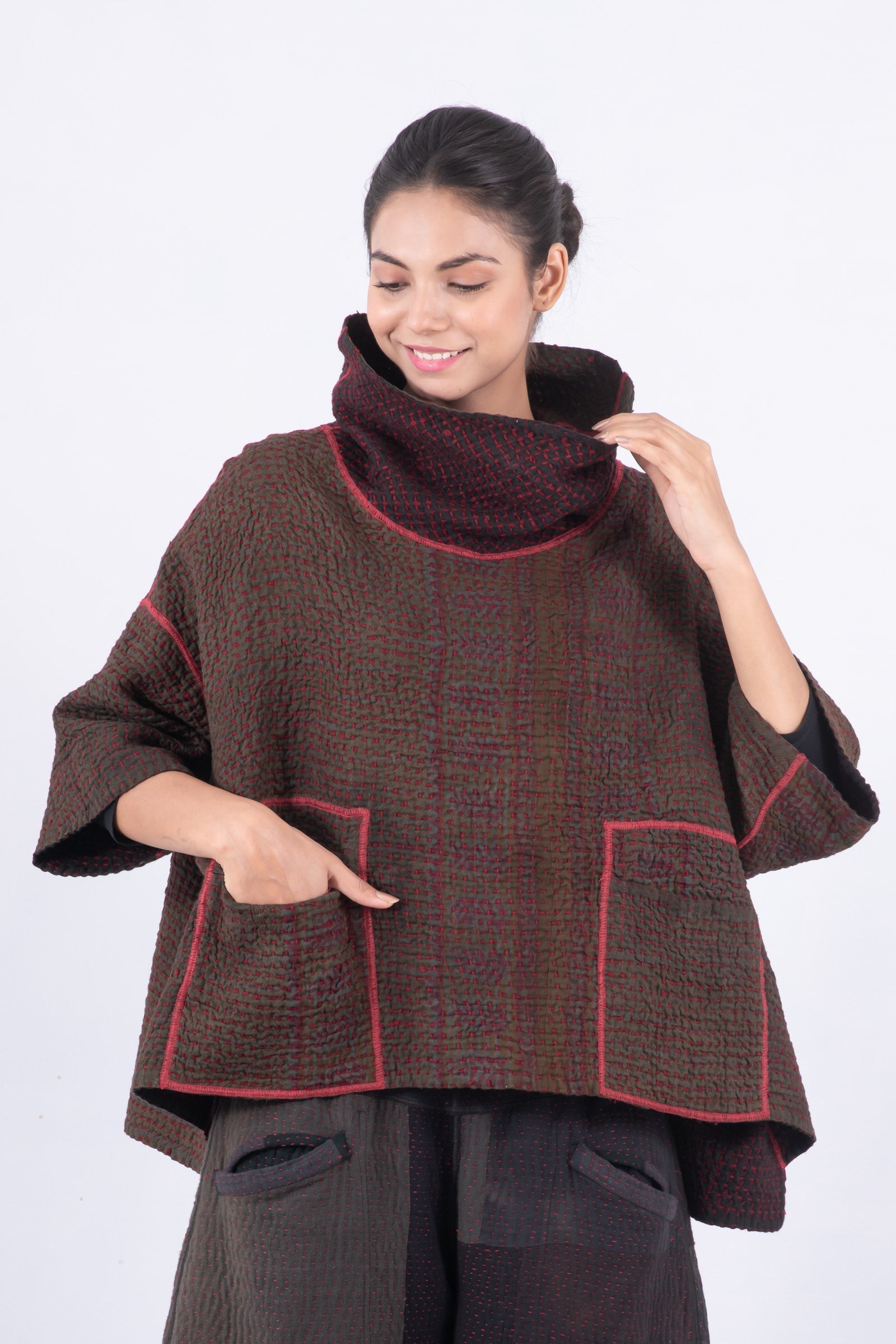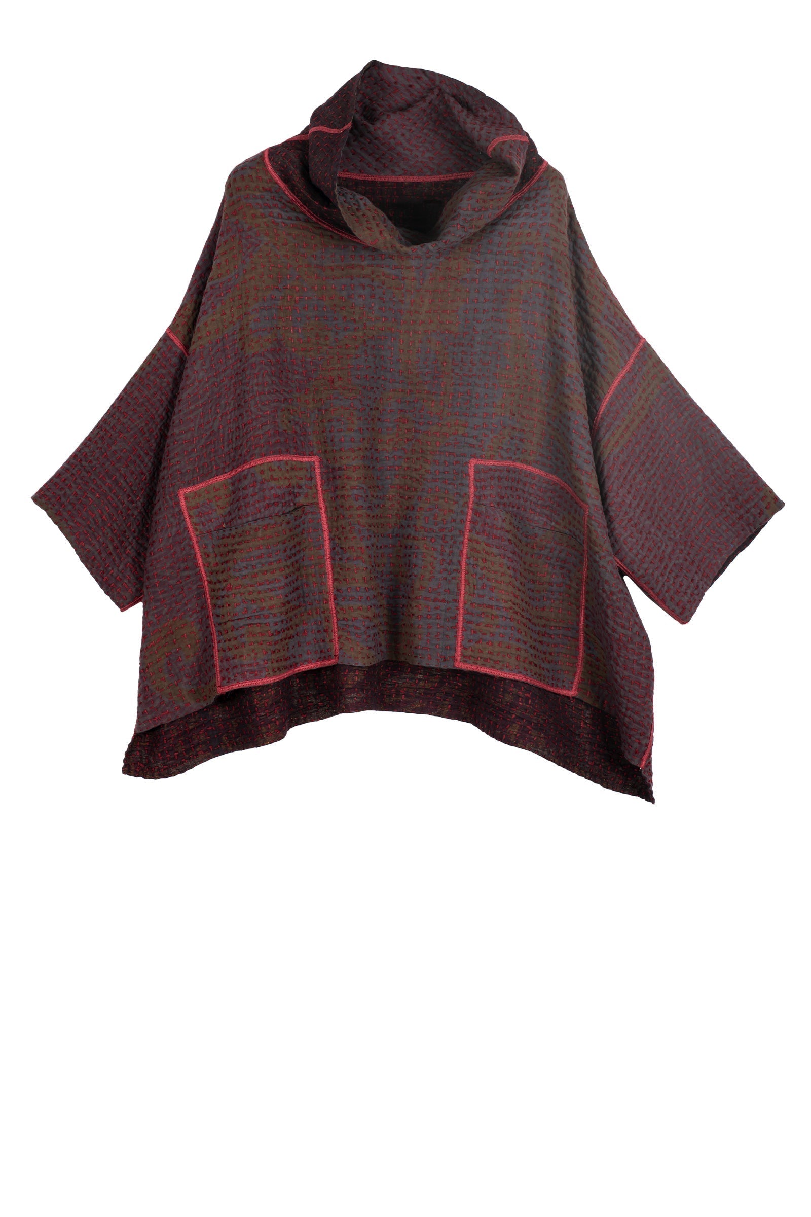 WOOL WAFFLE KANTHA COWL NECK PONCHO - ww3061-red -
