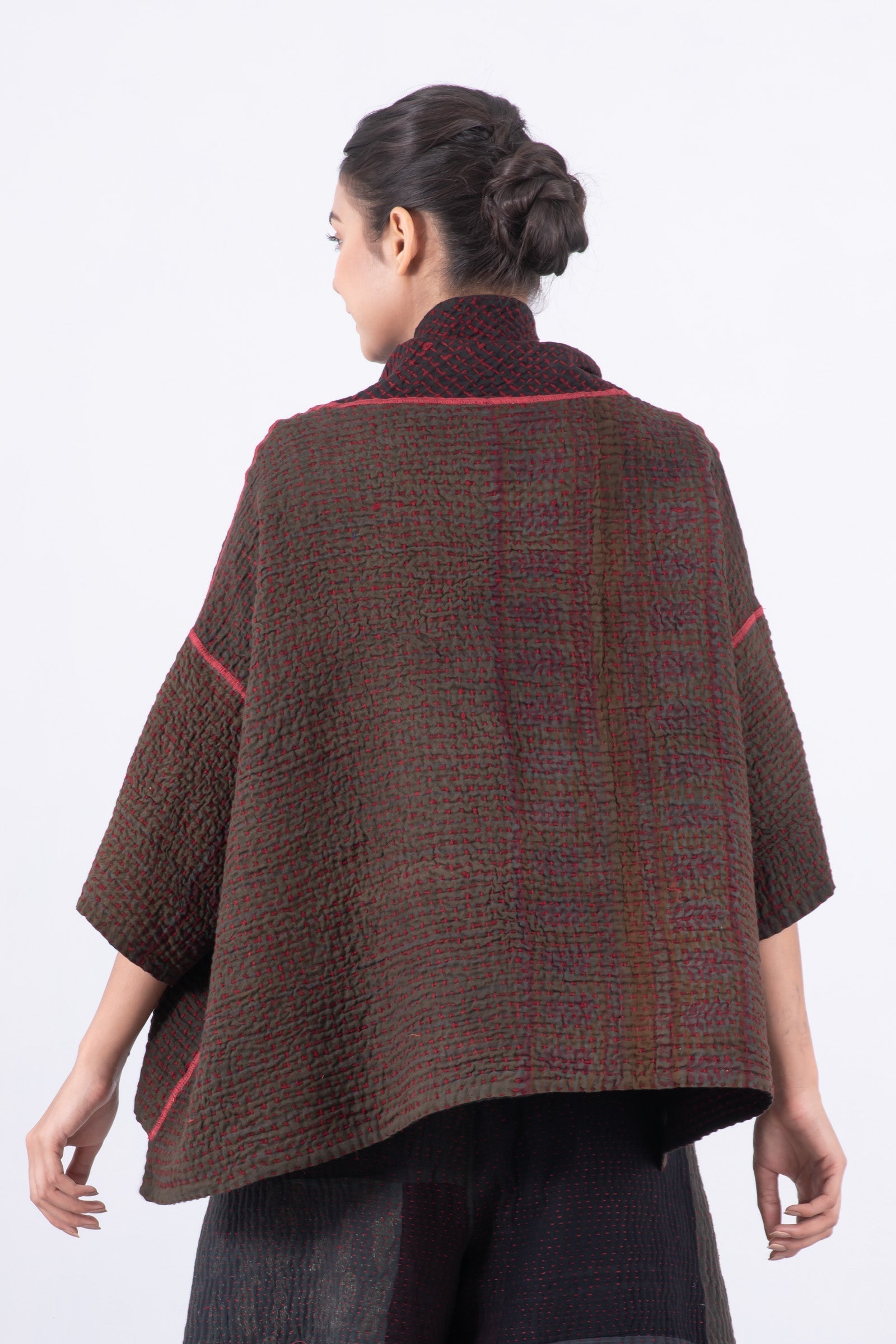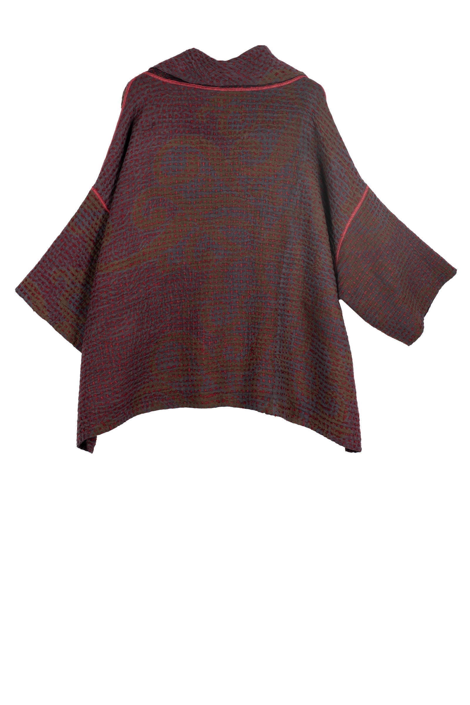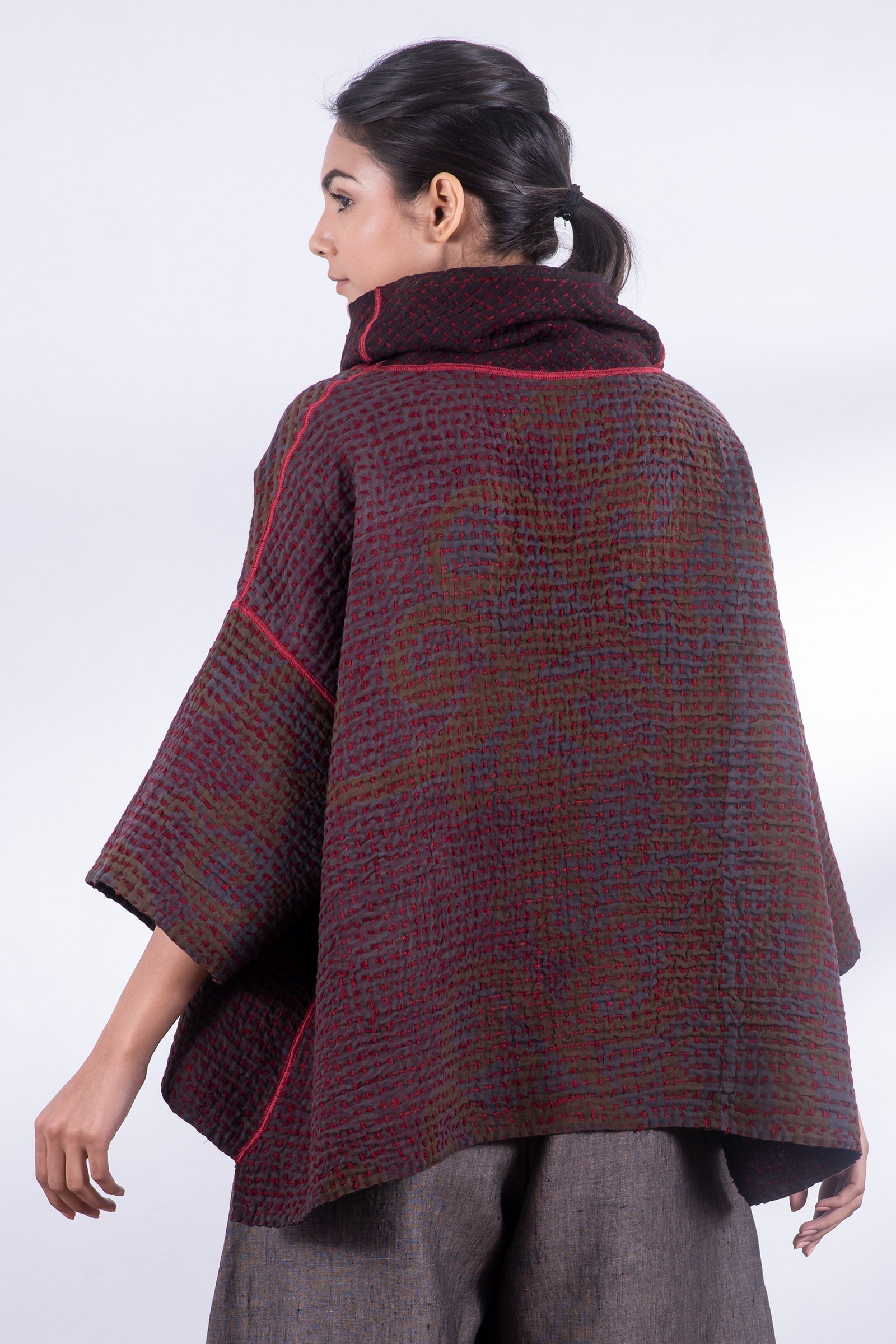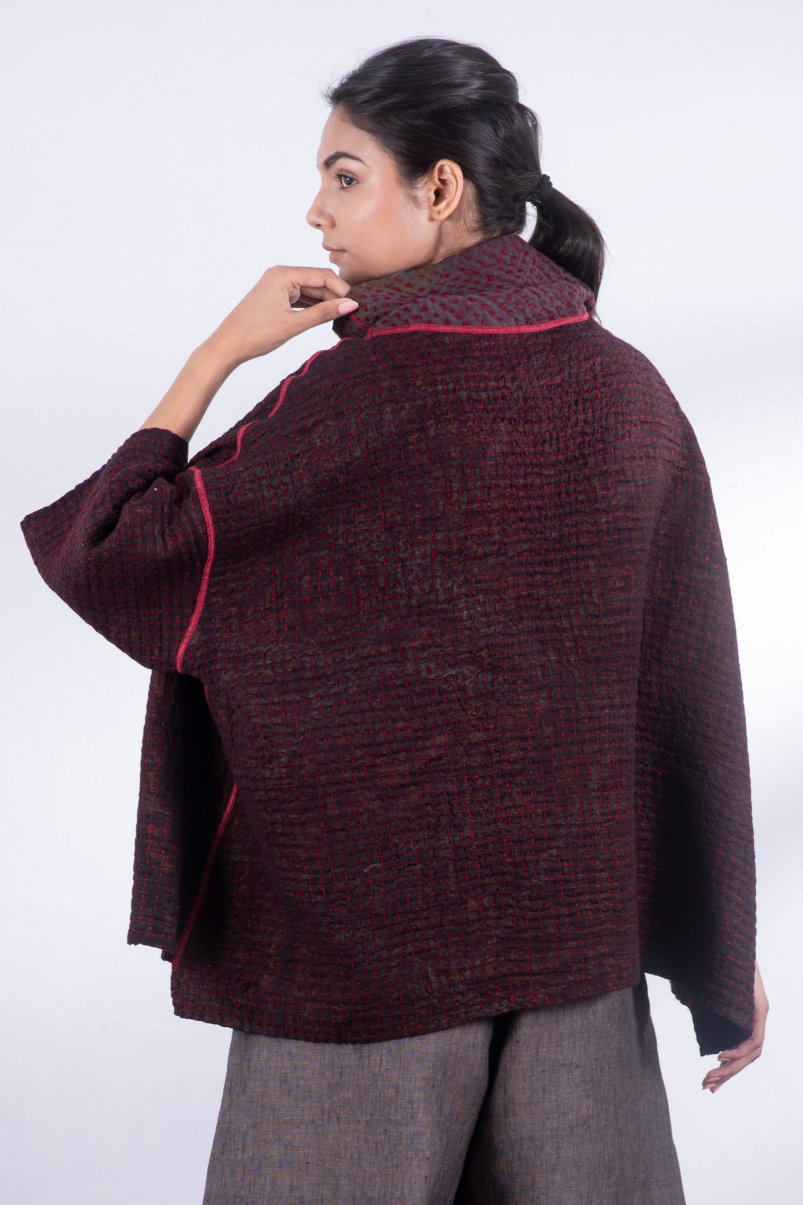 WOOL WAFFLE KANTHA COWL NECK PONCHO - ww3061-red -