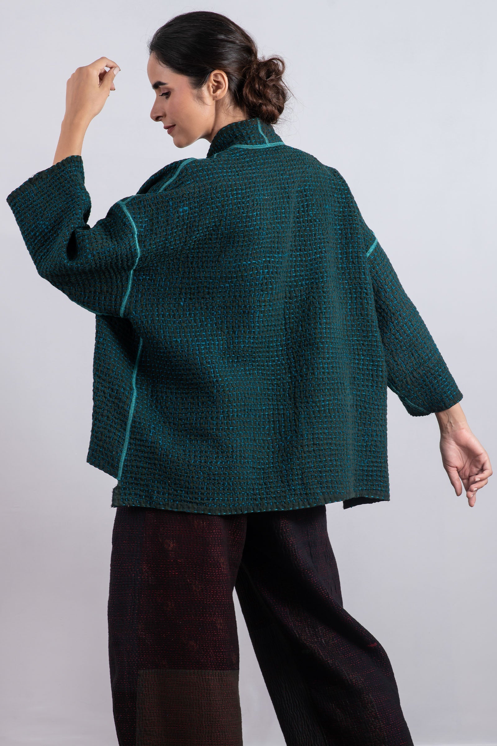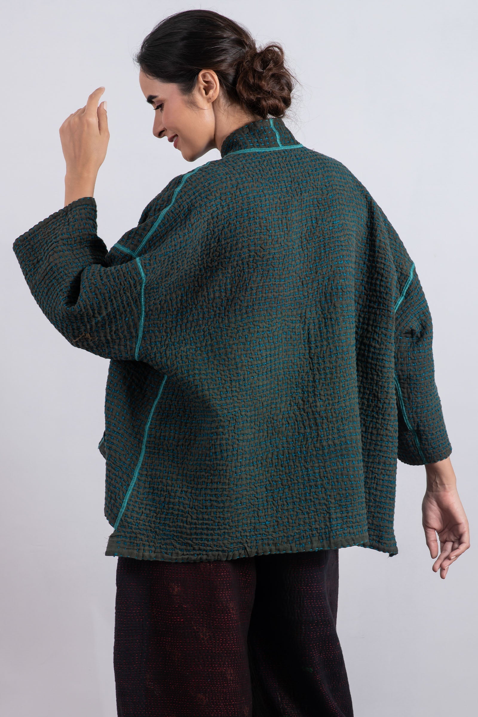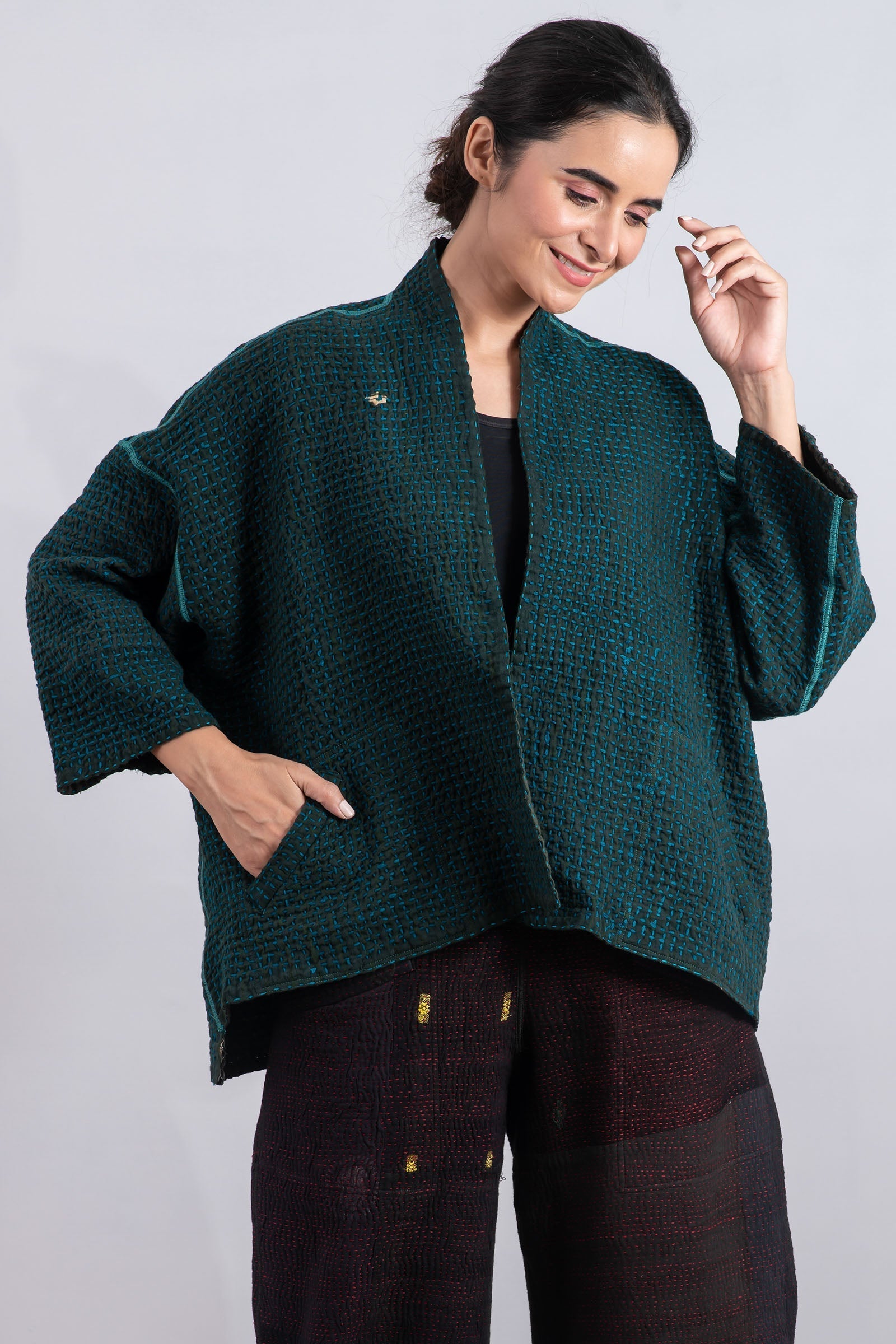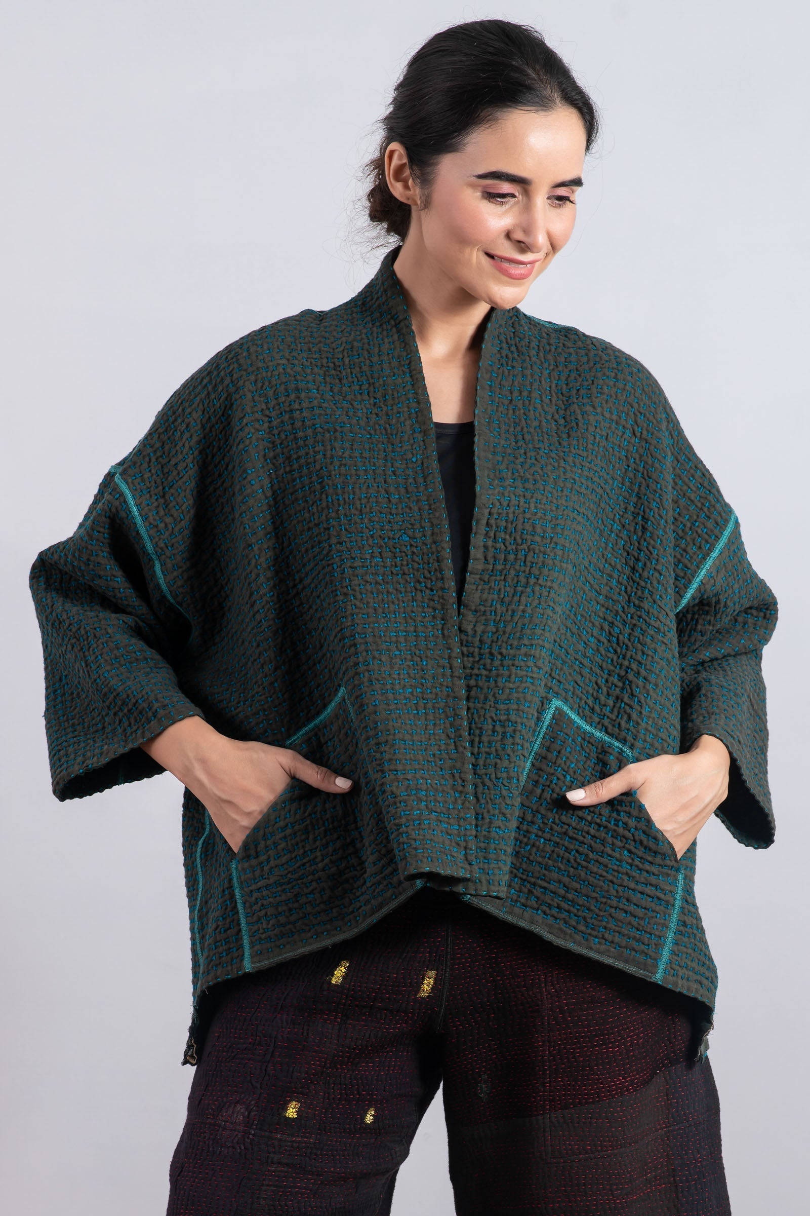 WOOL WAFFLE KANTHA MINI KIMONO JKT - ww3055-tel -